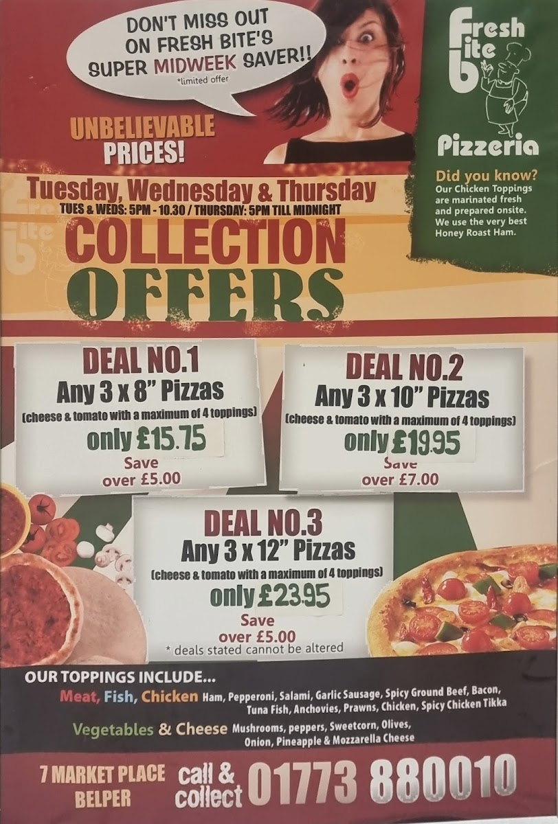 Welcome to Fresh Bite Pizzeria, where exceptional taste meets affordability in Belper! Nestled at 7 Market Pl, this pizzeria has captured the hearts of locals with its delicious, freshly made pizzas and mouth-watering burgers. The menu features a diverse selection, from classic Cheese & Tomato pizzas starting at just £4.30 to unique options like the Fresh Bite Special Burger, all crafted to please any palate.